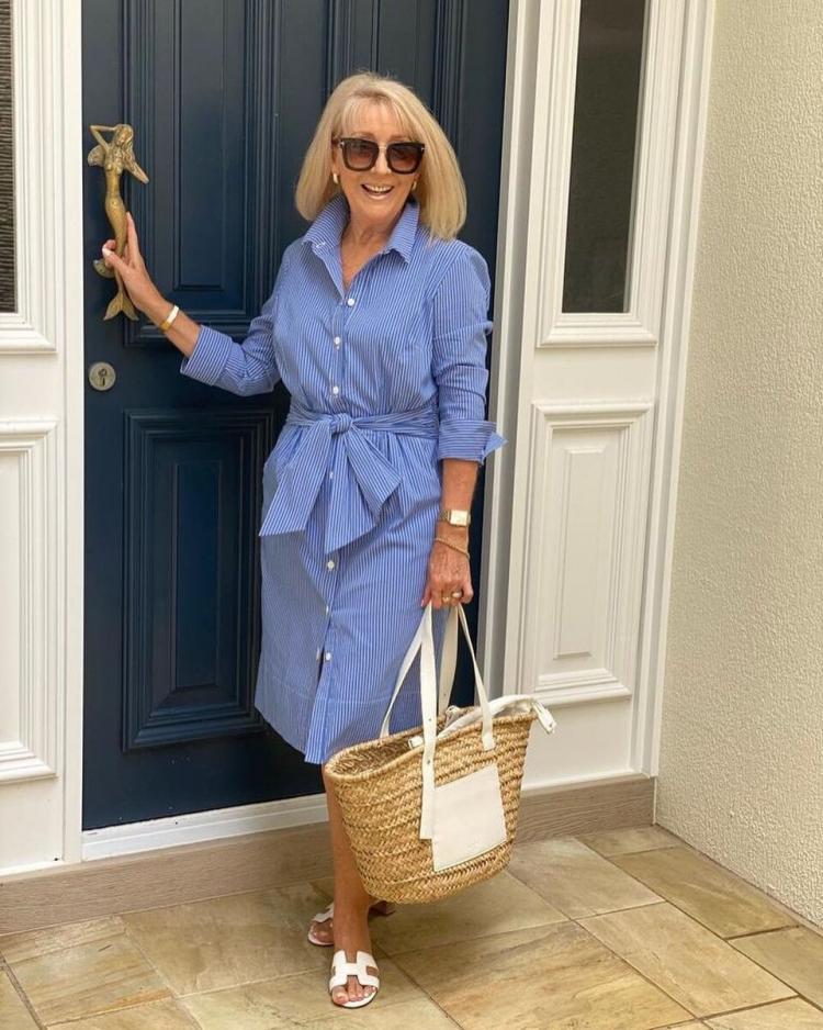Сорочка-сукня з акцентом. Блакитна сукня в тонку смужку з класичним кроєм, середньою довжиною та поясом — ідеальна база. Закочені рукави роблять образ трохи неформальним, але все ще стильним.