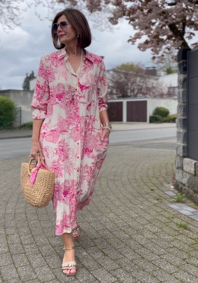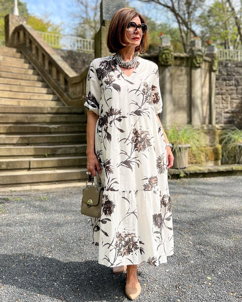 Светлые оттенки и нежный принт визуально освежают. Отдавайте предпочтение лёгким тканям и свободному силуэту.