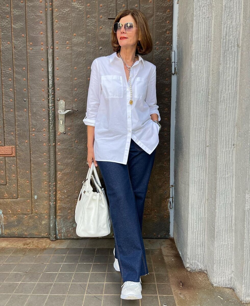 Классика, которая не подведёт. Выбирайте джинсы средней или высокой посадки, которые подчёркивают фигуру. Рубашку можно носить навыпуск, заправленной или завязанной узлом. Дополните образ белыми кроссовками или удобными лоферами.