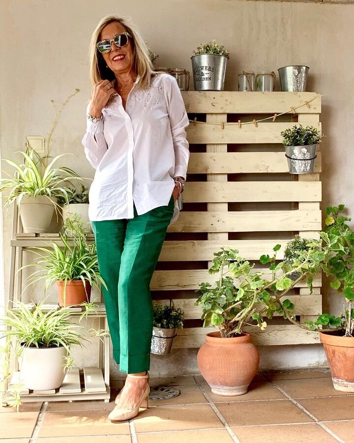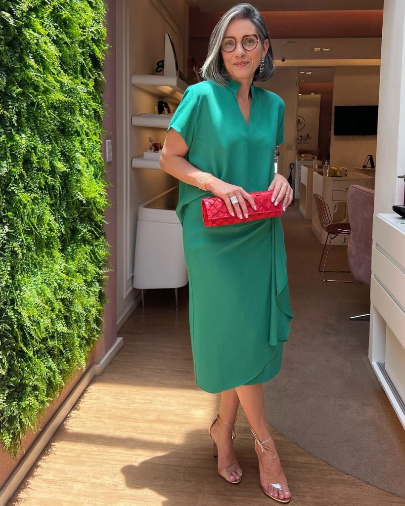 Изумрудный цвет — это благородный и приятный оттенок зелени. Модницы старше 50 лет с удовольствием носят изумрудную одежду как на работу, так и на прогулку или праздник. Изумрудный хорошо сочетается с ярким красным цветом, дополняя его лаконичными аксессуарами и украшениями.