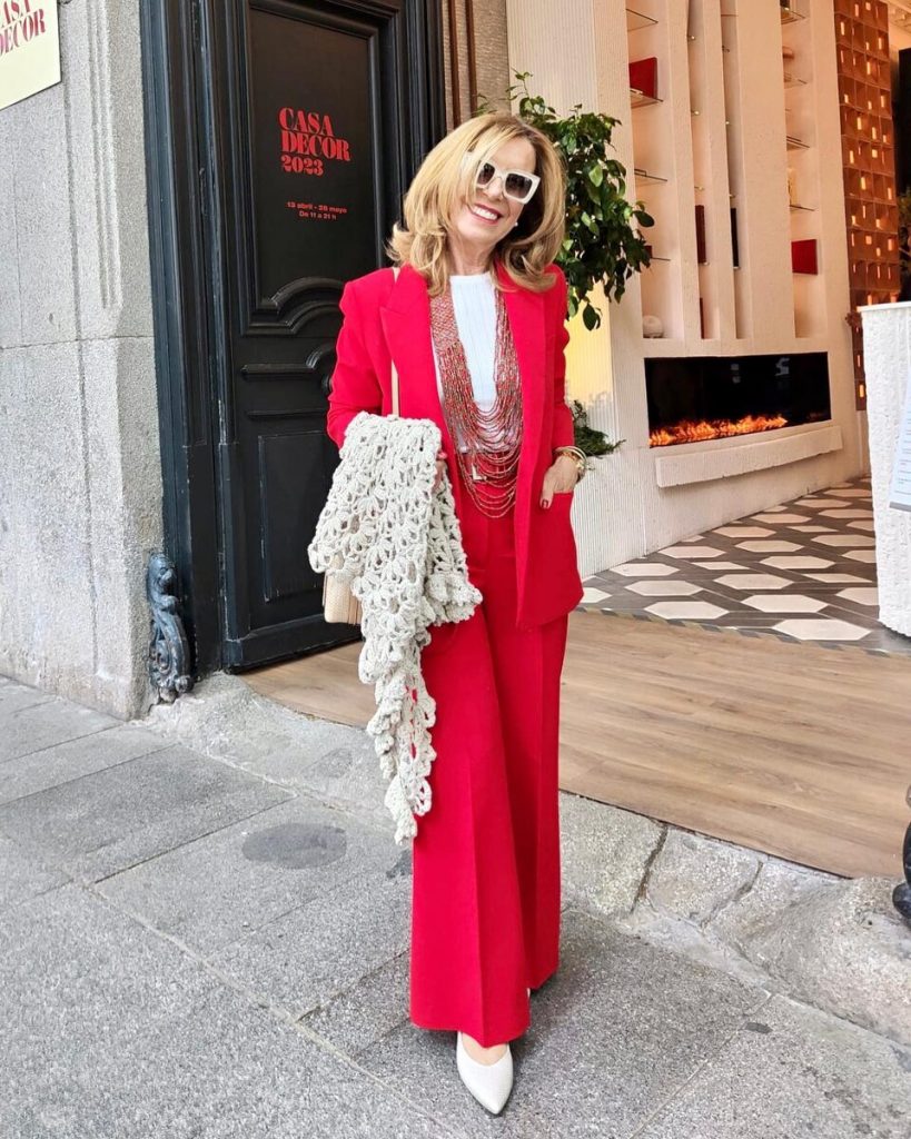 Энергичный красный цвет помогает создать впечатляющий монохромный образ. При желании его можно разбавить элементами ахроматических тонов. Красный также хорош в деталях: например, красная сумка отлично сочетается с ярким поясом и элементами на свитере.