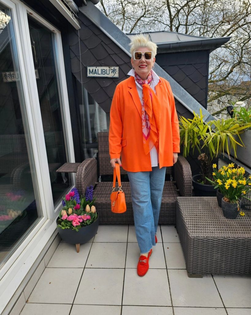 Морковный цвет — это насыщенный и немного капризный оттенок, особенно подходящий женщинам с теплым типом внешности. Он отлично сочетается с кэжуал-стилем, например, с белоснежной рубашкой, ярким жакетом и джинсами. Дополнительный освежающий эффект создают яркие аксессуары и обувь.