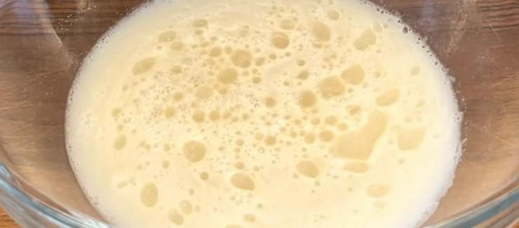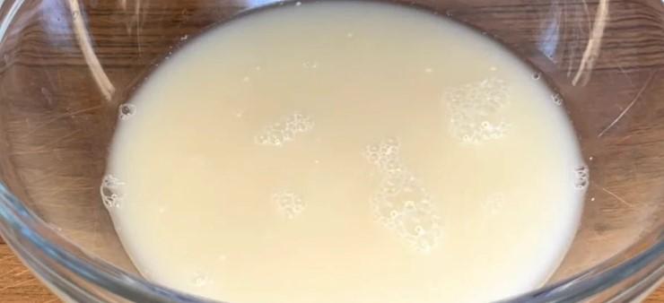 У миску великого розміру виливаємо теплу воду, насипаємо дріжджі і добре розмішуємо. Закриваємо кришкою та залишаємо до підняття дріжджів.