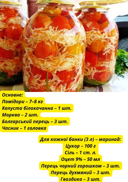 Цей рецепт поєднує все найкраще: солодкуваті мариновані помідори та хрусткий капустяний салат. Ідеальний варіант, коли хочеться смачно і просто. Взимку – пальчики оближеш! ![]()