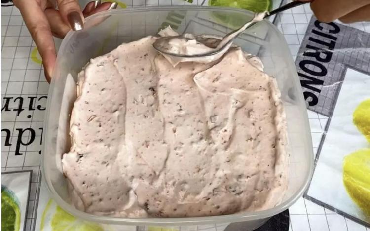 Получившуюся однородную массу нам нужно переложить в контейнер и убрать в морозилку на 5 часов, но еще лучше на всю ночь.