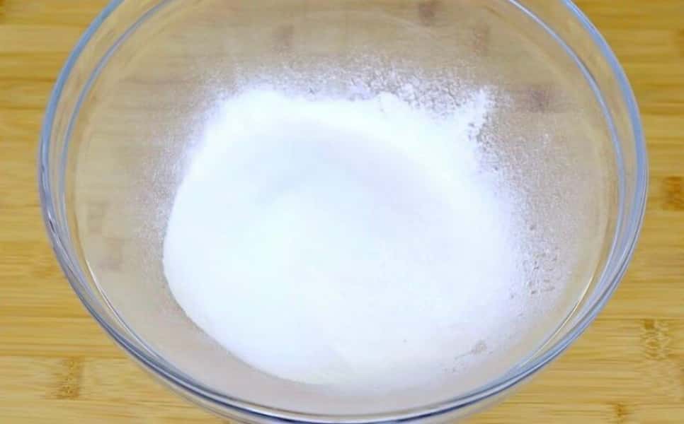 У глибоку миску просіюємо борошно і розпушувач. Всипаємо цукор і все перемішуємо.
