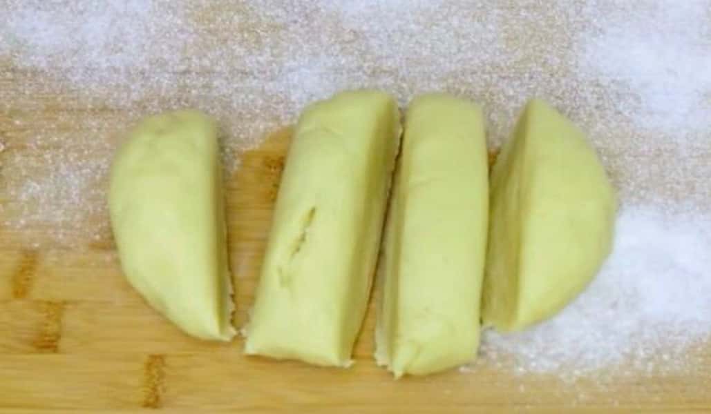 Робочу поверхню посипаємо борошном і викладаємо тісто. Поділяємо тісто на чотири рівні частини.