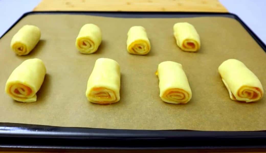 Обрізаємо неакуратні краї, потім розрізаємо навпіл і викладаємо на деко, заздалегідь застелене пергаментом. Випікаємо 20-25 хвилин, при температурі 170 градусів.