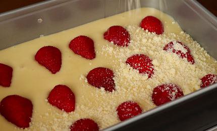 Викладаю половинки полуниці зрізом донизу. Потім посипаю все зверху підготовленою крихтою, щоб повністю покрити ягоди.
