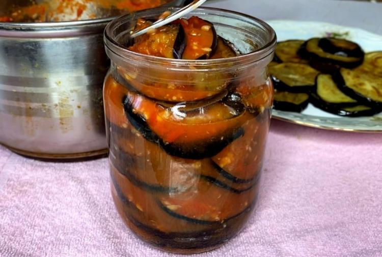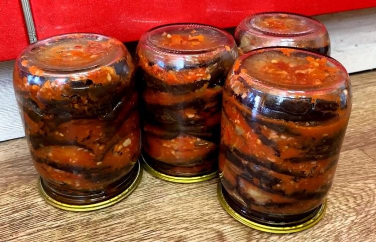 Обмакиваем обжаренные баклажаны в маринаде с обеих сторон. Плотно укладываем в чистые 0,5-литровые банки.