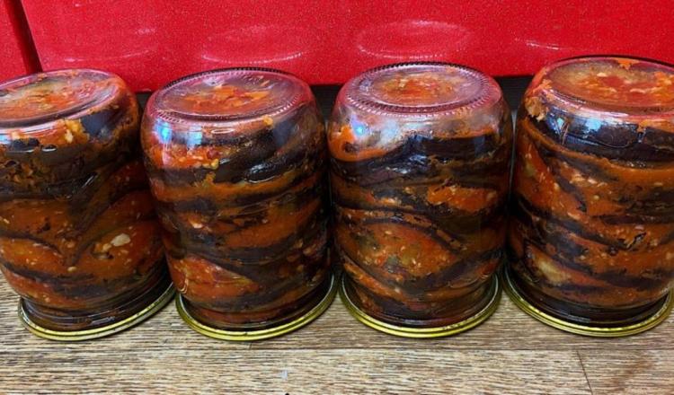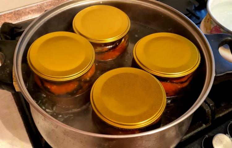 На дно кастрюли кладем полотенце, ставим банки с баклажанами. Заливаем водой по плечики банок. Доводим до кипения и стерилизуем 0,5-литровые банки 15 минут.