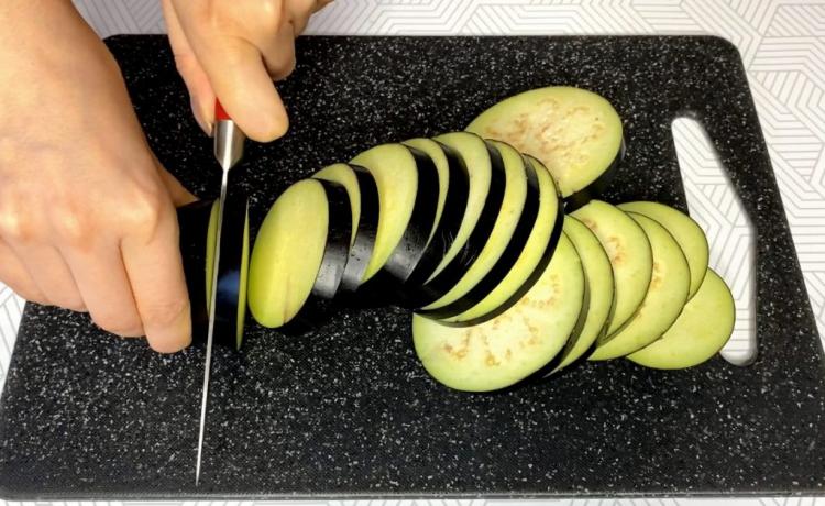 Баклажаны моем, нарезаем кружочками толщиной около 0,5 см и пересыпаем солью. Оставляем на 20 минут, чтобы ушла горечь.