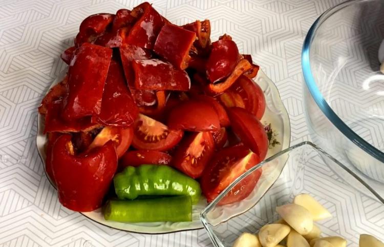 Перец, помидоры, лук и морковь пропускаем через мясорубку. Должно получиться около 1 литра овощной массы. Промываем и отжимаем баклажаны.