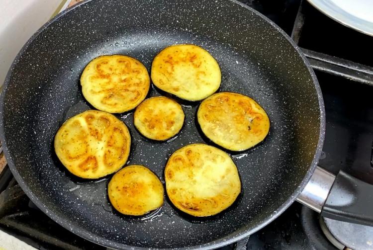 Разогреваем растительное масло на сковороде. Обжариваем баклажаны до золотистого цвета с обеих сторон. Используйте две сковороды, чтобы ускорить процесс.