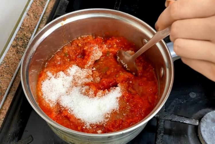 В кастрюлю с овощной смесью добавляем сахар, доводим до кипения. Вливаем уксус, перемешиваем, выключаем огонь.