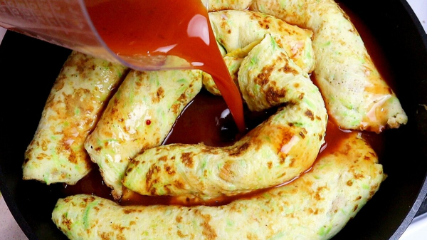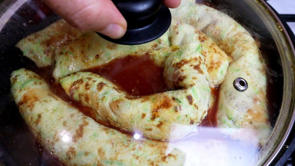 Далі беремо томатний сік і заливаємо наші млинці, так щоб вони були покриті рідиною на половину