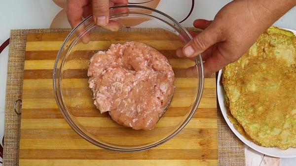 Готовий фарш тонким шаром намазуємо на наші млинці