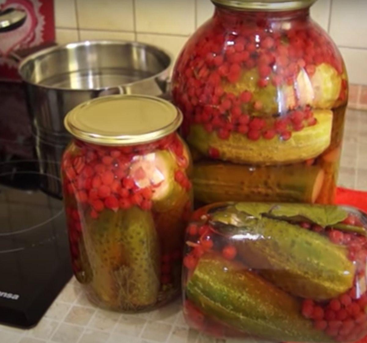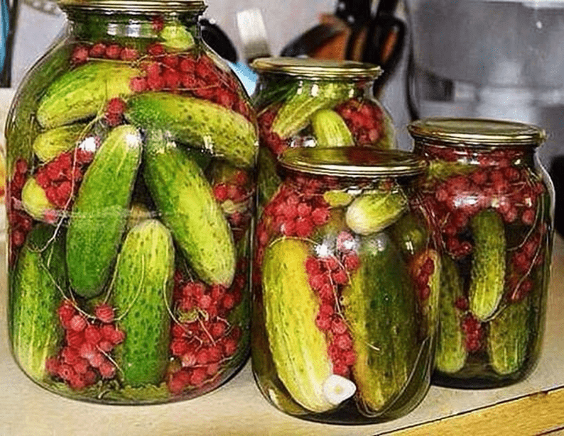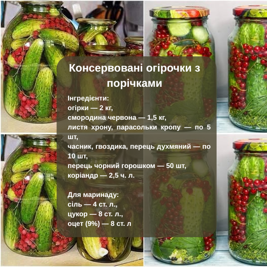 Пропонуємо законсервувати огірки з червоною смородиною. Така заготовка не лише відрізняється відмінними смаковими якостями, але і виглядає яскраво і незвично. Заготівлю краще робити в літрові банки, при цьому огірків в ній має бути 6-7 середнього розміру, а весь інший простір займає червона смородина. Засипають спеції, огірки заливають окропом і дають їм постояти чверть години. Далі маринад зливають, додають сіль, цукор і оцет. Заливають гарячим.