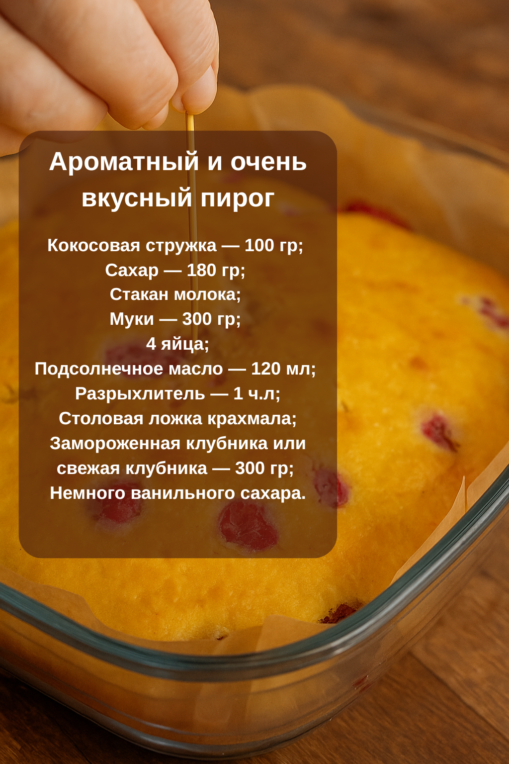 Сегодня я хочу рассказать вам о пироге, в котором используются два беспроигрышных ингредиента: кокосовая стружка и клубника.