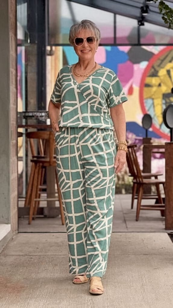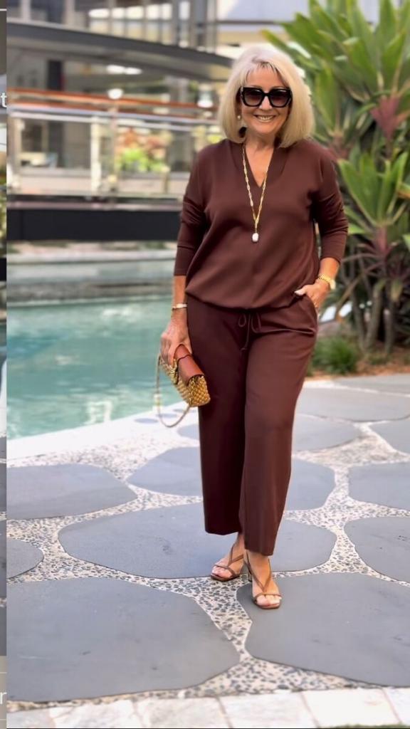 2. Насичений коричневий костюм з вільних штанів на резинці зі шнурком і блузки з V-подібним вирізом та рукавами, підігнутими до ліктів — справжнє відкриття. Він красиво підкреслює фігуру, але не привертає зайвої уваги до вікових змін. Колір — ідеальний: освіжає і додає образу молодості.