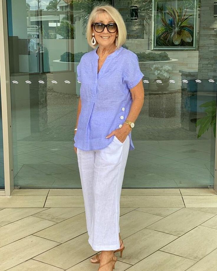 6. Світлі лляні штани та ніжно-бузкова блузка з коротким рукавом і декоративними ґудзиками з боків — це мій улюблений комплект на щодень. Дуже зручно, приємно до тіла і виглядає охайно навіть у спеку.