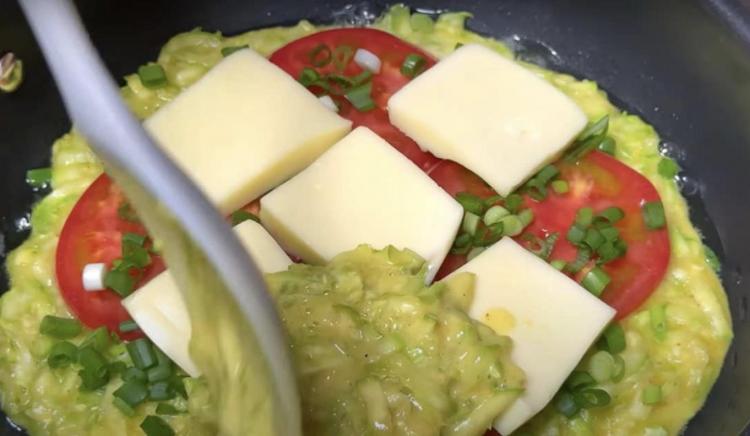Розігріваю пательню середнього розміру. Трохи змащую олійкою. Викладаю половину кабачкової маси. Зверху на неї кружечки томатів і шматочками нарізаний сир.