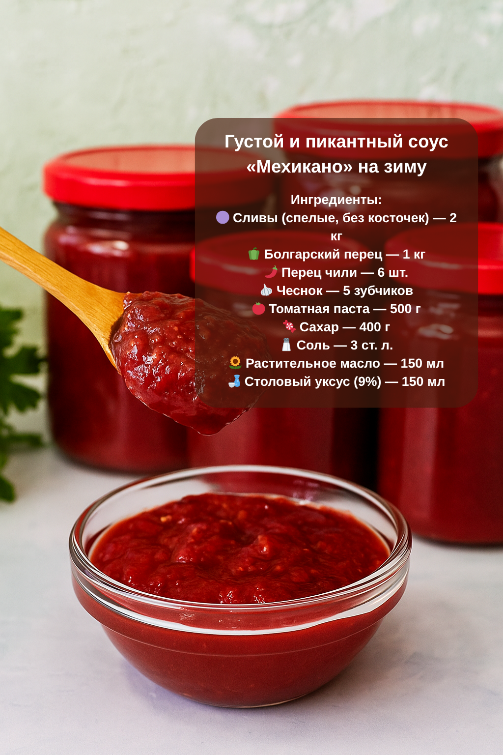 Если вы любите ароматные, насыщенные и слегка острые соусы — этот рецепт обязательно должен быть в вашей кулинарной коллекции. Домашний соус «Мехикано» — настоящая находка для зимних заготовок: в меру острый, пряный, фруктово-овощной, он идеально дополняет мясо, курицу, запечённые овощи и даже крупы.