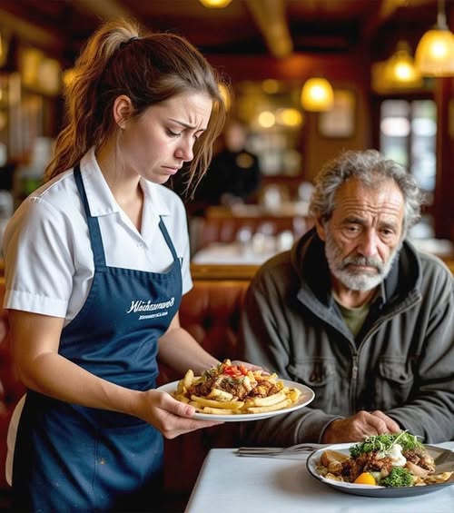 Когда из кухни вынесли блюда, Настя машинально взяла заказ для пожилой пары… и понесла его мужчине у окна. Только поставив перед ним дорогие блюда, она осознала, что всё перепутала.
