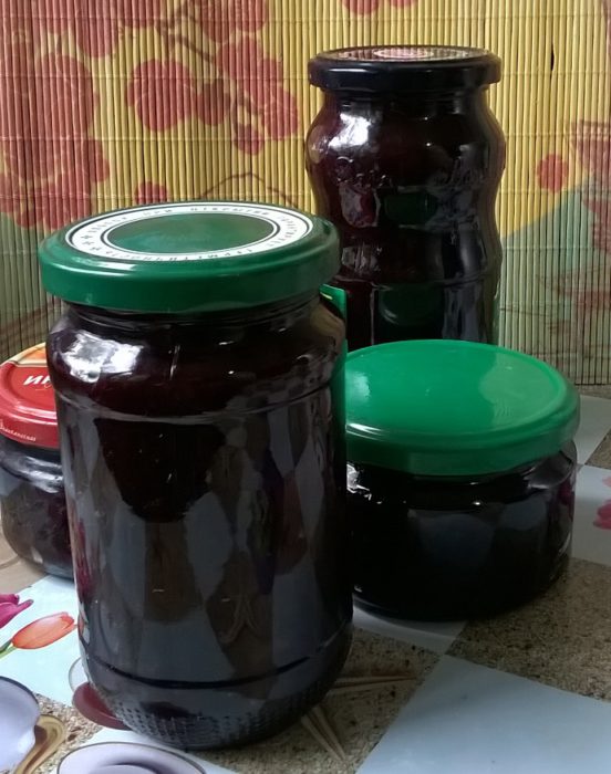 Гаряче розкладаю по стерилізованих банках (я це роблю в мікрохвильовці). Якщо охолоне — буде складно викласти, бо повидло густе, майже як паста. Закриваю кришками й залишаю охолоняти.