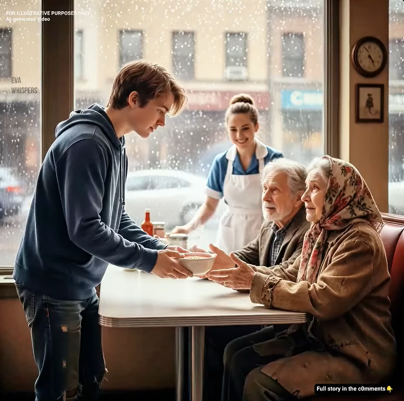 Как только официантка поставила перед ним дымящуюся тарелку, колокольчик над дверью зазвенел. Вошла пожилая пара — промокшая, дрожащая, но держащаяся за руки. Пальто мужчины было порвано, ботинки женщины хлюпали при каждом шаге. Они выглядели усталыми… и голодными.