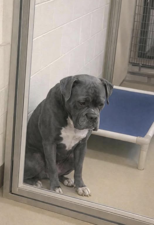 В тихом вольере, за стеклом, сидел питбуль — большой, мощный, с голубовато-серой шерстью, белым пятном на груди и красным ошейником на шее. Его поза была самой печальной из всех, что я когда-либо видел. Питбулей часто клеймят как агрессивных и опасных, хотя на самом деле они невероятно преданные, чуткие и очень ориентированные на человека.