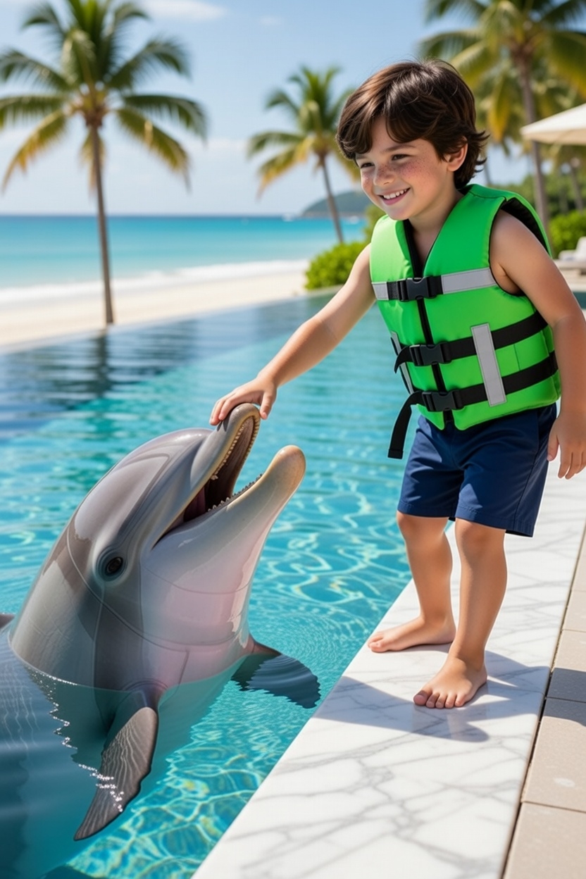 Когда мы приехали, он переоделся быстрее всех детей в раздевалке и первым побежал к бассейну. Мы стояли в стороне и наблюдали. Сын осторожно протянул руку, дельфин подплыл, высунул мордочку из воды и позволил себя погладить. Они будто сразу нашли общий язык. Дельфин крутился рядом с ним, подпрыгивал, снова подплывал ближе, касался воды хвостом, не отплывал ни на секунду.